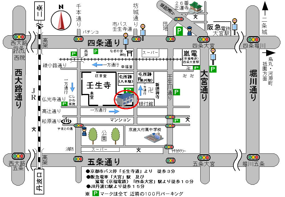 壬生老人ホームへの最寄り駅は、市バス「壬生寺道」 阪急「大宮」 京福電車「四条大宮」が最寄り駅です。各種乗り換えや運行状況につきましては各交通機関の運行状況よりご確認ください。