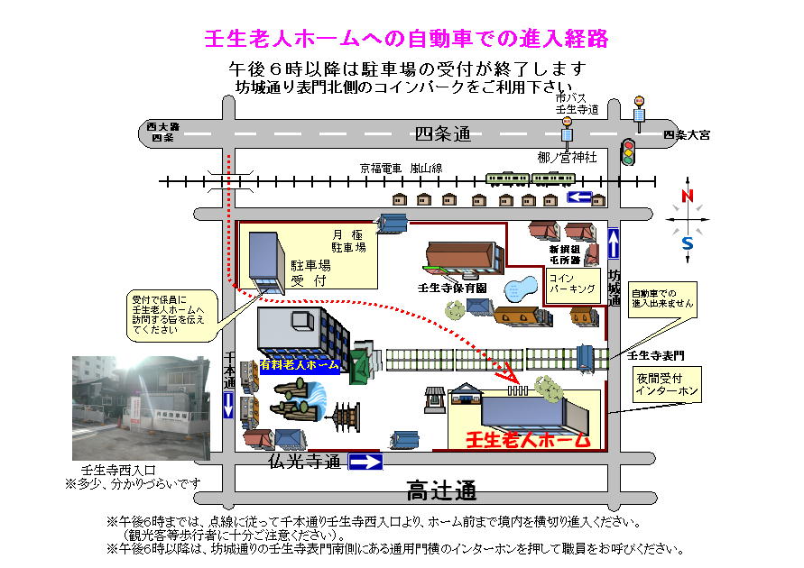 壬生老人ホームは、京都市の中心部、歴史ある壬生寺の境内に位置し、電車やバスでのアクセスも便利です。お車でお越しの方には駐車場もご用意しております。ご来訪の際は、下記のアクセス情報をご確認ください。